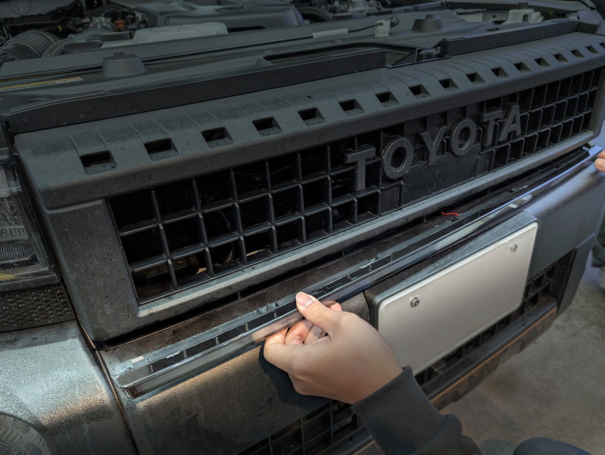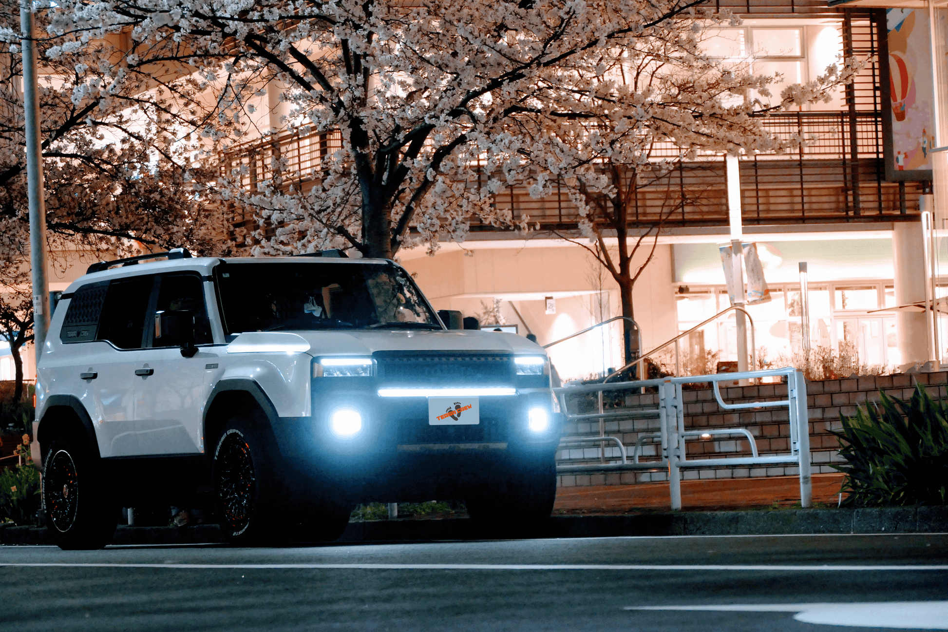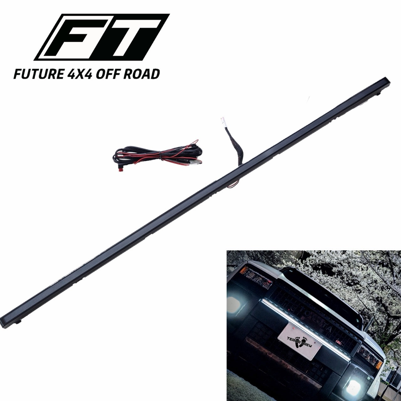 ランクル250のグリル下部に取り付けるFUTURE4×4OFFROAD製LEDアクションデイライトバーは、デイタイムライトを追加することができるアイテムです。点灯直後はオープニングアクション機能が付いており、250のワイド感をより魅力的に演出します。